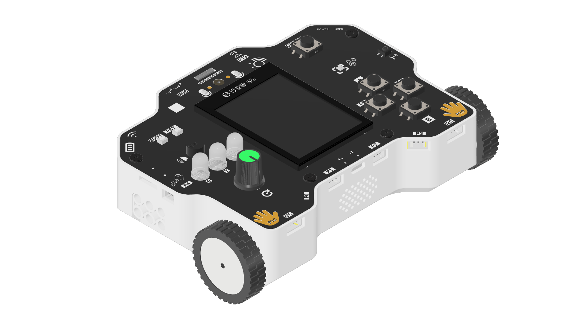 | 实体按键 | ON/OFF按键:长按可开机/关机A按键(上按键):与K10单板上A按键功能一样B按键(上按键):与K10单板上B按键功能一样左按键:P8右按键:P9RST:复位按键BOOT:硬件初始化按键 |