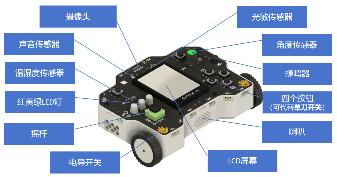 行空板M10实验盒以行空板M10为核心,CPU、内存、蓝牙等核心参数,可以跳转到行空板M10 WIKI 了解核心部件。