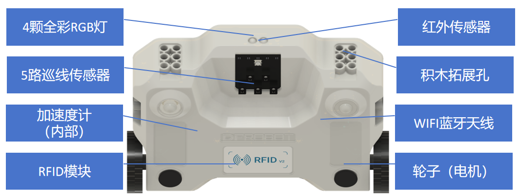 注:5路巡线传感器,电机,轮子,microSD卡接口,USB TYPE-A接口,SR04超声波传感器属于高配版中的功能。